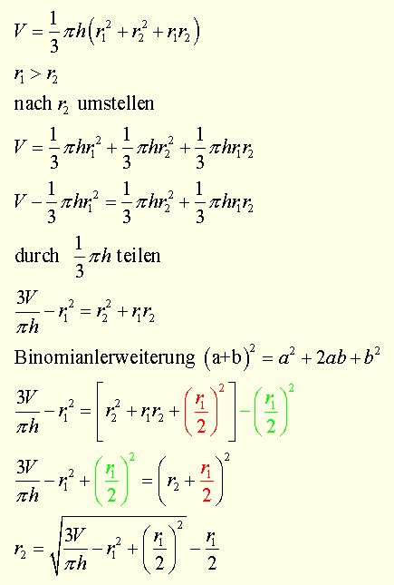 Gesucht wird der kleinere Durchmesser eines Kegelstumpfes. Gegeben sind die Körperhöhe, das Volumen und der größere Durchmesser. Wer hilft mir die Formel umzustellen? |